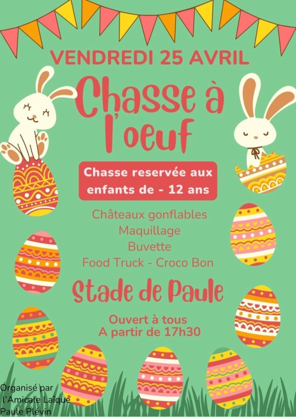 Accueil › Agenda › Chasse à l’œuf – Amicale laïque Paule Plévin Chasse à l’œuf – Amicale laïque Paule Plévin Une chasse à l’œuf est organisée par l'Amicale laïque Paule Plévin le vendredi 25 avril. 25 avril 2025 Chasse à l’œuf au stade de Paule Une chasse à l’œuf est organisée par l'Amicale laïque Paule Plévin le vendredi 25 avril.Ouvert à tous à partir de 17h30 au Stade de Paule.Chasse réservée aux enfants de -12 ans.Châteaux gonflables, maquillage, buvette, food truck (Crocro Bon) Autres évènements Couscous à emporter par Coup de patte du Kreiz Breizh sam. 28 mars 2026 Repas à emporter par la société de chasse La Pauloise sam. 11 avril 2026 Randonnée de Festi'Paule - informations à venir sam. 25 avril 2026
