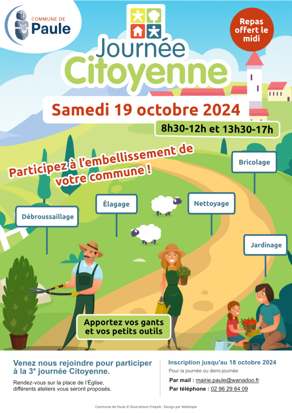 Inscription jusqu'au 18 octobre 2024 pour la journée ou la demi-journée par mail : mairie.paule@wanadoo.fr ou par téléphone : 0296296409