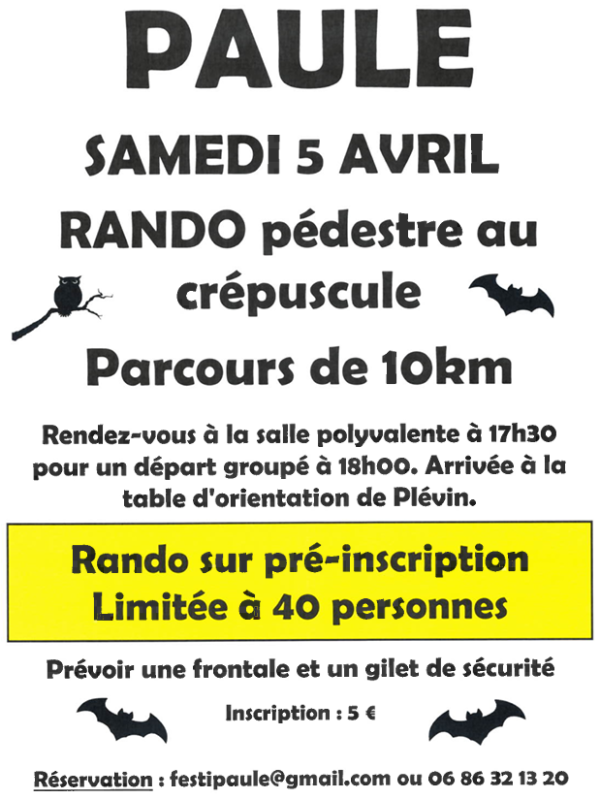 Accueil › Agenda › Rando pédestre au crépuscule – Festi'Paule Rando pédestre au crépuscule – Festi'Paule Rando pédestre au crépuscule le samedi 5 avril, Parcours de 10 km organisé par Festi'Paule 05 avril 2025 Rando pédestre au crépuscule Parcours de 10 kmRendez-vous à la salle polyvalente à 17h30 pour un départ groupé à 18h00.Arrivée à la table d’orientation de Plévin.Rando sur pré-inscription - limitée à 40 personnesImportant : prévoir une frontale et un gilet de sécurité.Inscription : 5 €Réservation : festipaule@gmail.com ou 06 86 32 13 20 Autres évènements Soirée Disco - Amicale Laïque Paule/plévin sam. 04 avril 2026 Repas à emporter par la société de chasse La Pauloise sam. 11 avril 2026 Randonnée de Festi'Paule sam. 25 avril 2026