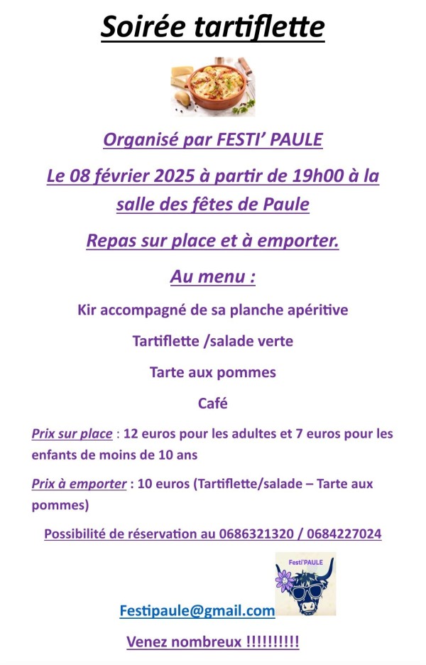 [Évènement annulé] Soirée tartiflette organisée par FESTI' PAULE Le 08 février 2025 à partir de 19h00 à la salle des fêtes de Paule