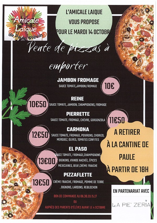 L’Amicale Laïque de Paule Plévin vous propose une Vente de pizzas à emporter le mardi 14 octobre en partenariat avec La Pie’Zeria