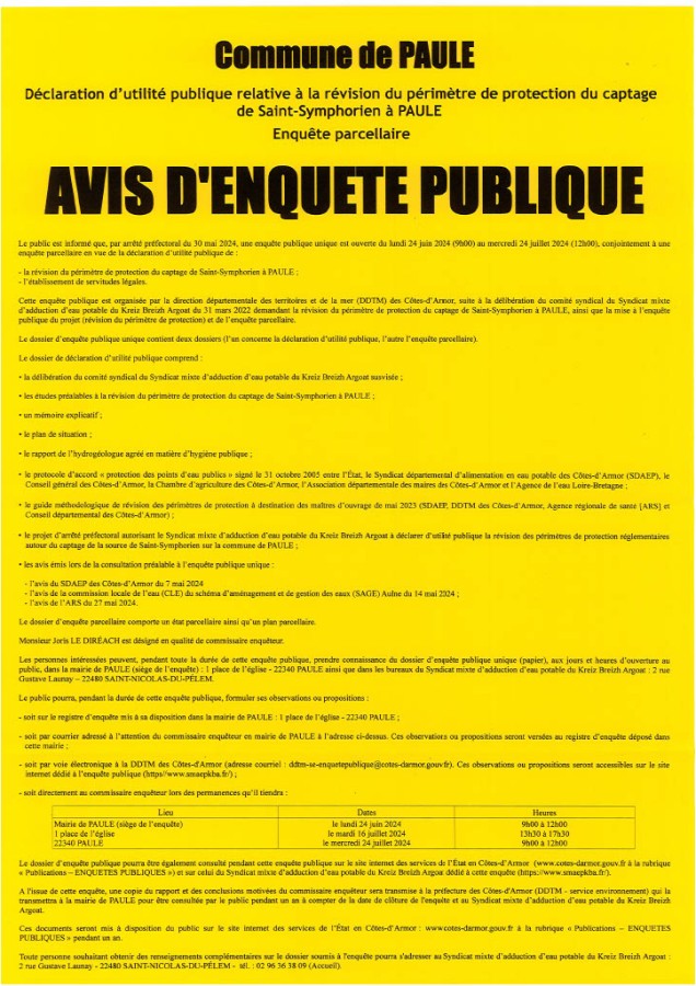 A l'issue de cette enquête, une copie du rapport et des conclusions motivées du commissaire enquêteur sera transmise à la préfecture des Côtes-d'Armor (DDTM - service environnement) qui la transmettra à la mairie de PAULE pour être consultée par le public pendant un an à compter de la date de clôture de l'enquête et au Syndicat mixte d'adduction d'eau potable du Kreiz Breizh Argoat.