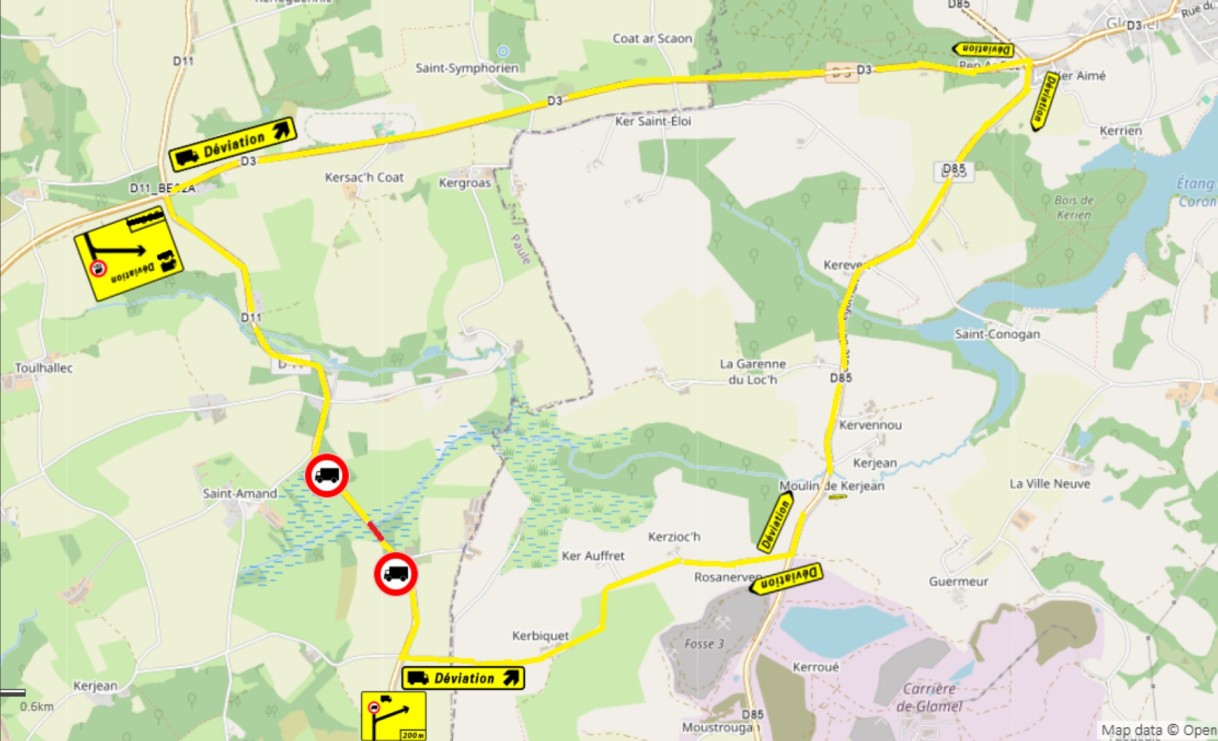Les poids lourds sont invités à contourner la zone endommagée en empruntant la D3 vers l'est jusqu'à Pen Ar Roz, et la D85 au sud en passant par Kervennou et Kerjean, avant de rejoindre Rosanervez et Kerbiquet pour retrouver la D11, et inversement.